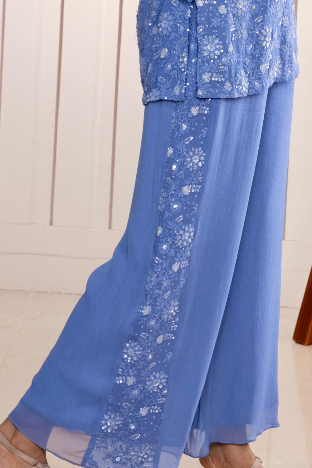 Intricately hand-embroidered jacket paired with a inlay pants. Comes with a matching bustier for effortless layering.