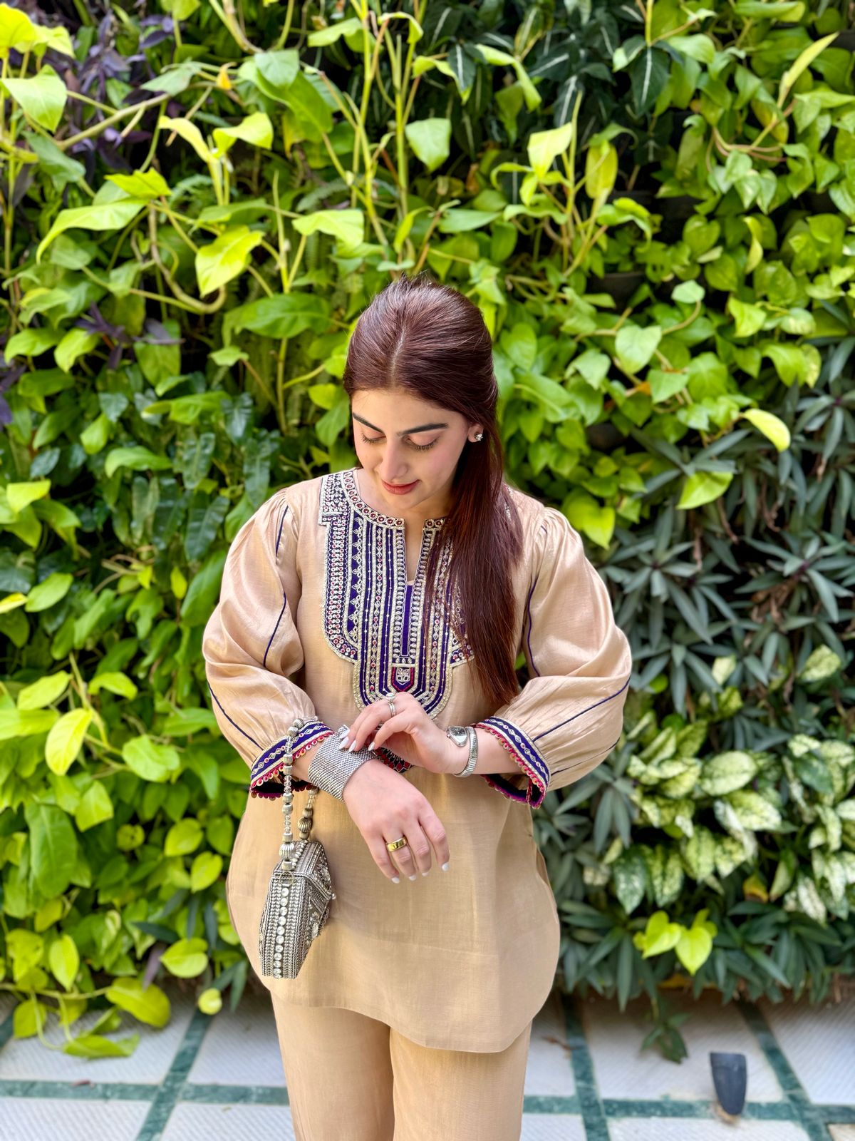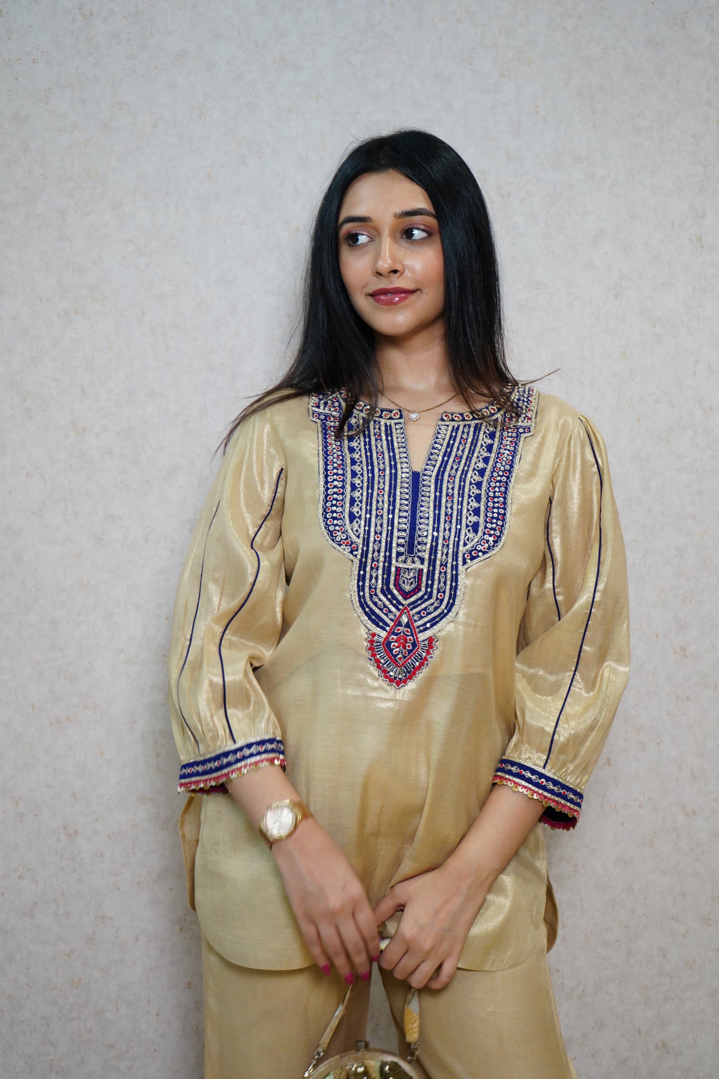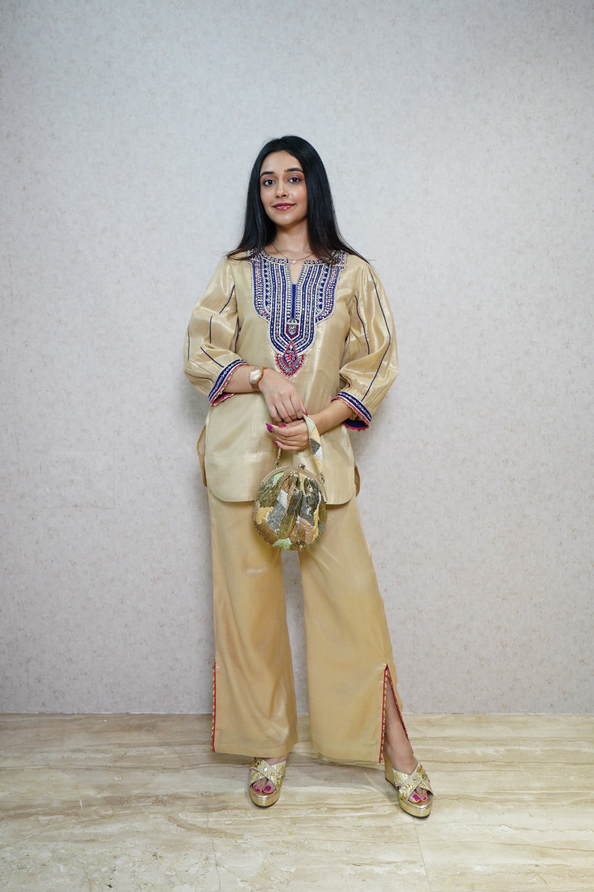 Relaxed fit kurta intricately hand-embroidered paired with co ordinated side slit pants. Comes with a matching bustier for effortless layering.